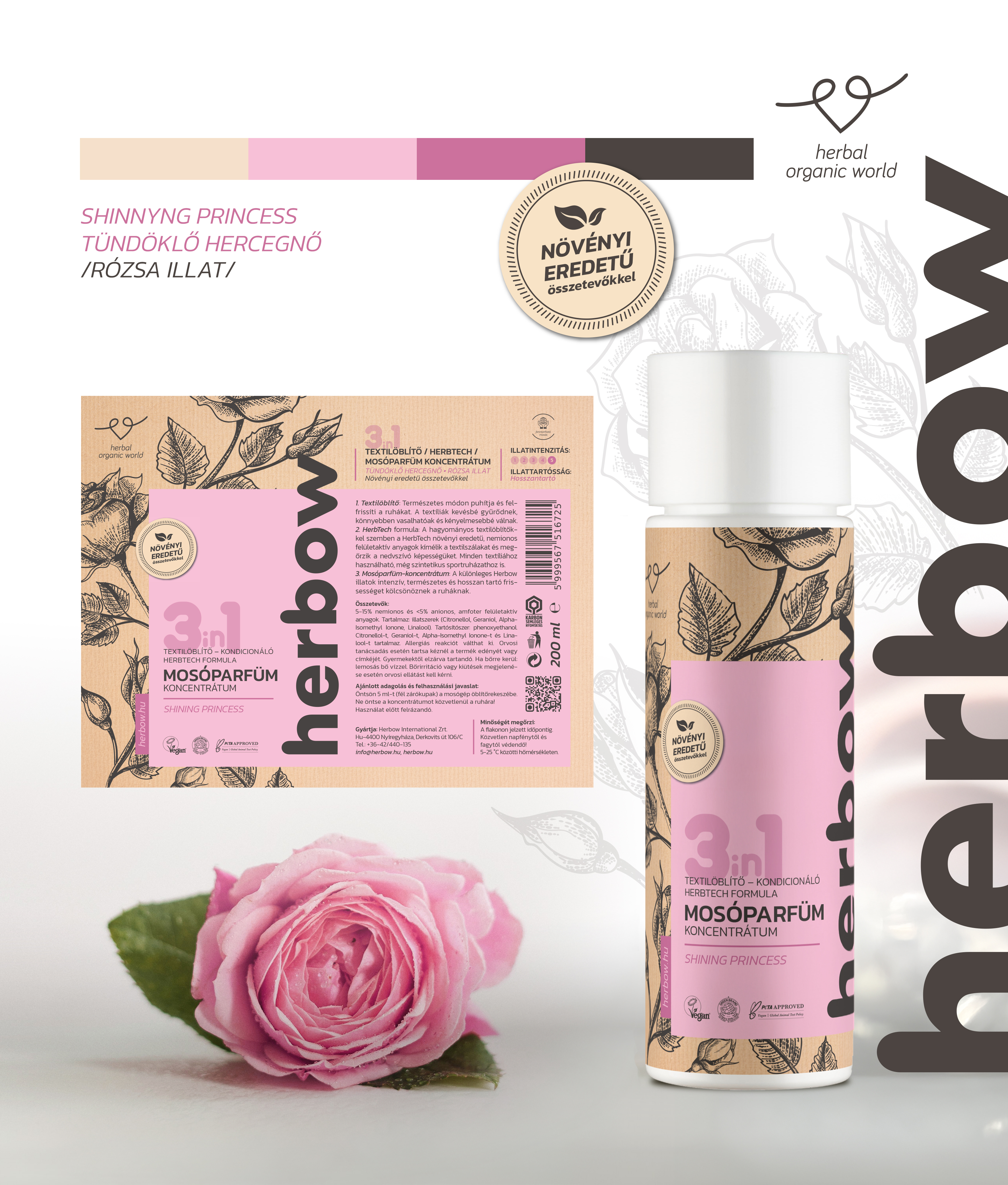 A Tündöklő Hercegnő illata a rózsa eleganciáját és a vanília lágy melegségét egyesíti. Finom, virágos illat, amely egyszerre nőies és harmonikus, és minden mosás után elegáns, tiszta frissességet hagy a textíliákon. A Herbow 3in1 Mosóparfümök új generációs textilápolók, amelyek a természet erejét és a modern technológiát ötvözik egyetlen formulában. Innovatív HerbTech 3in1 összetételük egyesíti a mosóparfüm, a textilfrissítő és a textillágyító hatását, így a ruhák nemcsak hosszan illatosak, hanem puhák, könnyen kezelhetők és kellemes tapintásúak maradnak. A növényi eredetű, kíméletes összetevők ápolják a textíliákat, miközben megőrzik természetes nedvszívó képességüket. Minden mosás után a ruhák friss, természetes illatot és tartós puhaságot kapnak – anélkül, hogy a bőrt vagy a környezetet terhelnék.