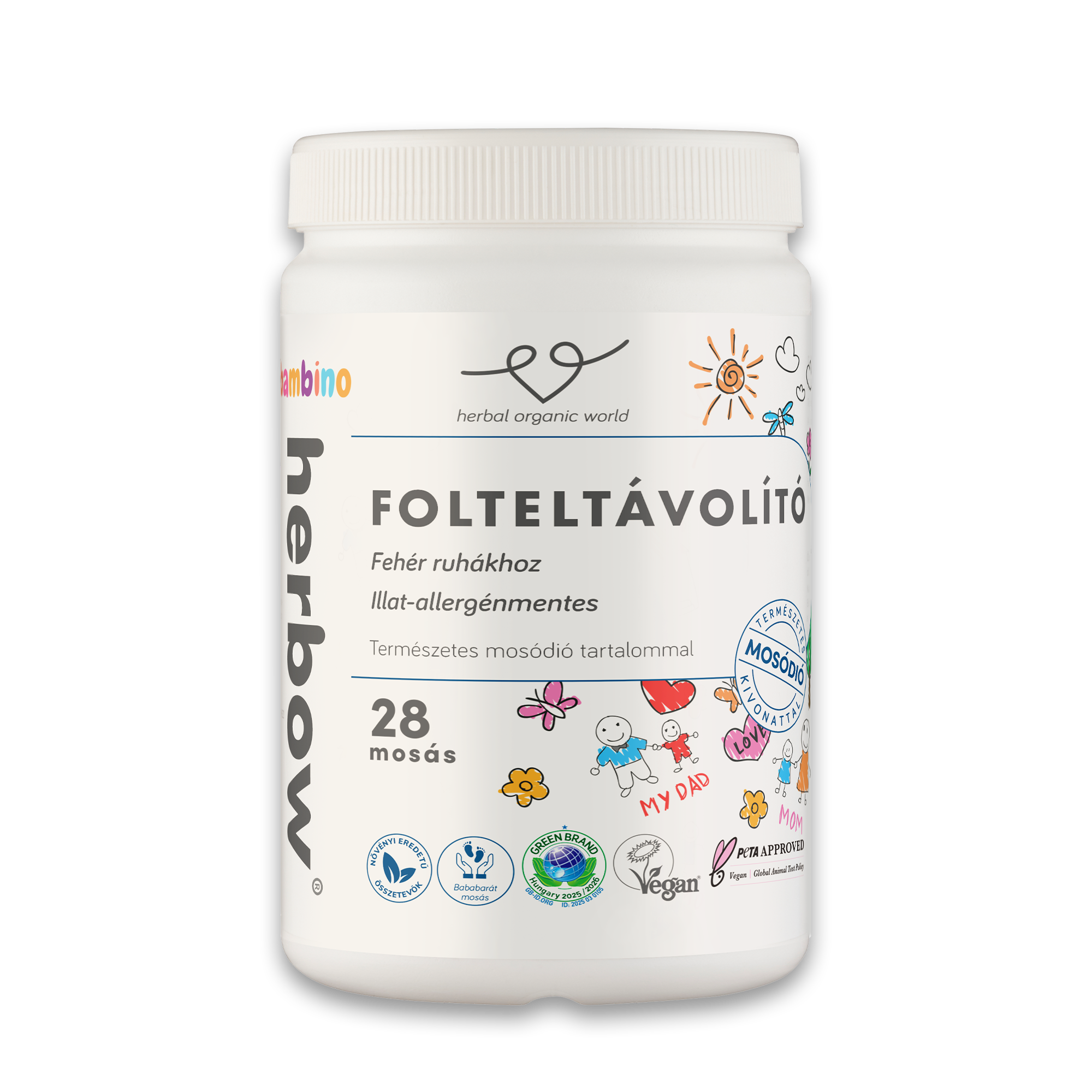 A Herbow Bambino Folttisztító fehér ruhákhoz Illat- és allergénmentes különleges, bőr- és környezetkímélő formula, amelyet kifejezetten érzékeny bőrű babák, gyermekek és felnőttek fehér ruháihoz fejlesztettek.